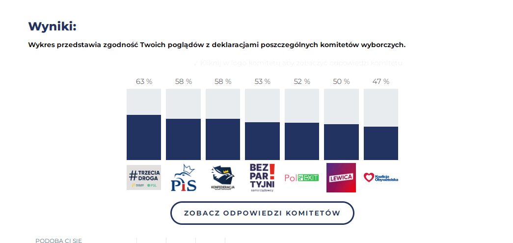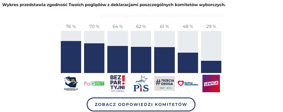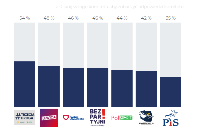 74% polexit, 65% konfa, 57% pis, 57% bezpartyjni, 47% trzecia droga, 39% koalicja, 36% lewica