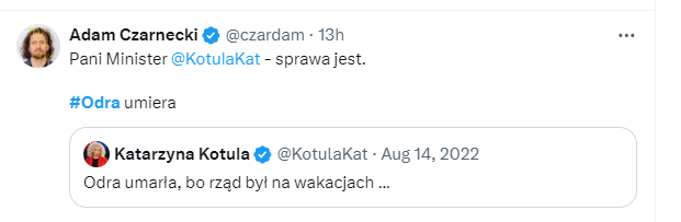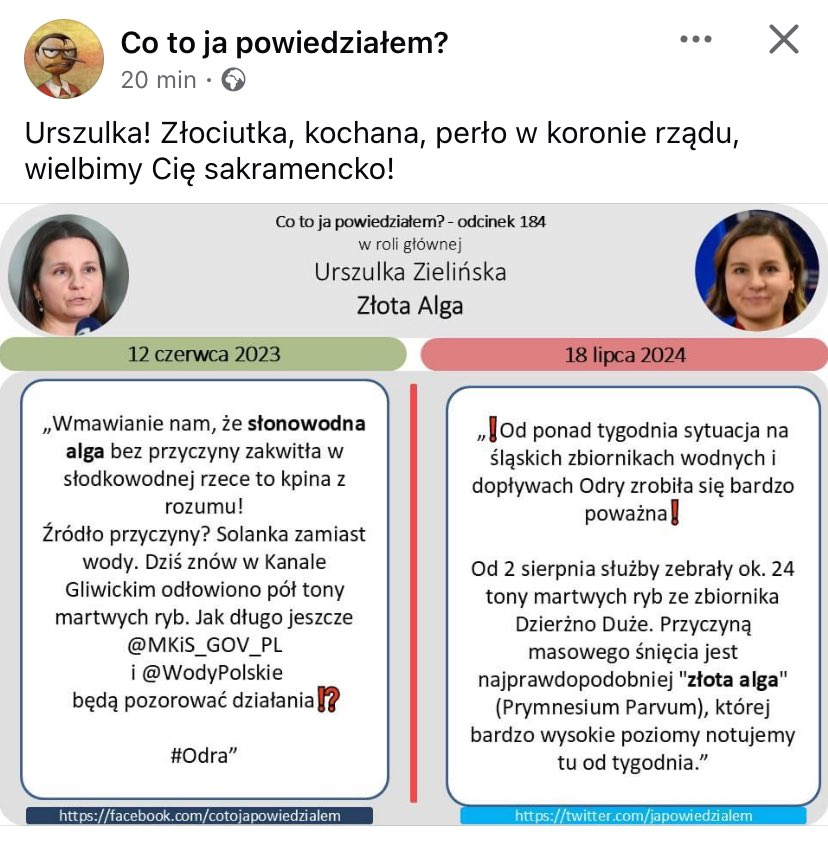 A jak jest naprawde? Po pierwszym wystapieniu grubej przyduchy po falach upalow w rzece dwa lata temu, co prawda rzad leniwie bo moze akurat sierpien i moze pana ministra nie bylo a bez niego nie mozna (a moze byl inny temat grzany wtedy, serio nie pamietam juz dokladnie ale wkurwiala mnie ta opieszalosc), przystapiono do akcji napowietrzania rzeki przez osp i strazakow, w miedzyczasie rozne grupy spoleczne pomagaly usuwac sniete ryby aby jeszcze bardziej nie zajebac odry mulem. Kto mieszka nad rzeka ten wie, ze od lat coraz czesciej to zjawisko wystepuje i po prostu ryby leza do gory brzuchem podczas wielodniowych upalow rzedu 30+ bo nie ma powietrza w wodzie ktora napowietrza sie wlasnie przez skoki wody na kaskadach, progach itp. Nie mialem wtedy pojecia, ze moze to wystapic w takiej skali, niestety, nie mam doradzcow ani ekspertow na wyciagniecie reki. Politycy maja a i tak uzyli Odry to politycznej gry pierdolac kocopoly. I wlasnie teraz te kocopoly pieknie sie starzeja na ich niekorzysc. Jachirka juz nie chodzi ze sloikami po majonezie po sejmie, nikt juz nie twierdzi ze ktos cos wlewa do rzeki. Roznica chyba tylko taka, ze tera te ryby plynace do gory brzuchem sie usmiechaja i dobrze ze pis nie rzadzi xD
