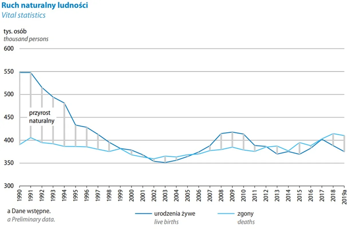 Lata 90te: 300-500 tys. urodzeń