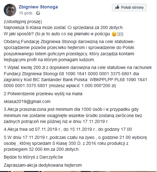 nie istnieje żadna 'fundacja zbigniewa stonogi' a piniążki trafiają na jego prywatne konto:kappa