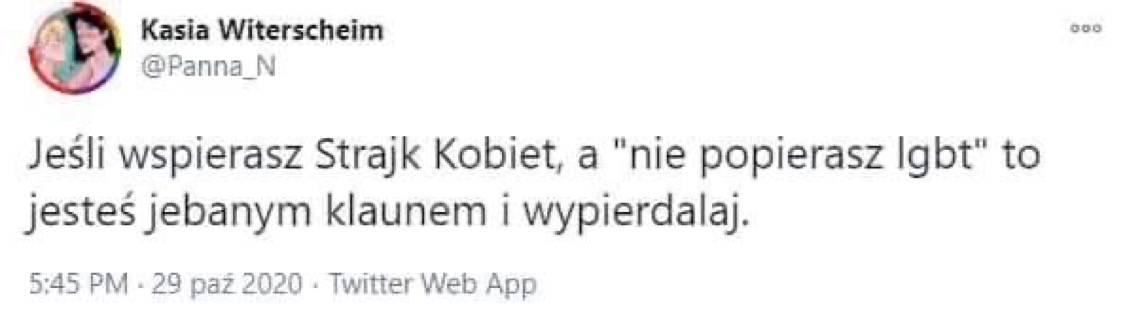 Dziś w ogóle gadałem z koleżanką o tej sytuacji, okazało się, że ona też mocno w strajki i w ogóle, mówię jej że spoko, no ale Kaczyński sobie protestującymi jak dzieciaczkami gra i napuszcza wszystkich na siebie, to ostatecznie zakończyła rozmowę obrażona twierdząc, że mam agresywny styl pisania i generalizuję grupy ludzi, w tym te w których ona się znajduje, przy czym 15 sekund wcześniej wjeżdżała sobie na cały kościół jaki on zły.