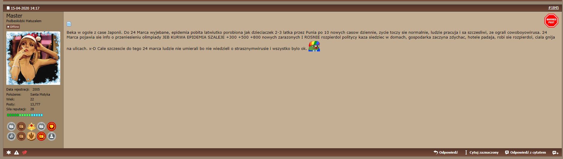 to było jesienią 2019, a wiosną 2020 wybuchła pandemia i nagle nastąpiła transformacja z confaboya w coronaboya, od tej pory każdemu kto choćby w małym stopniu się z nim nie zgadzał, to przypisywał z automatu że jest "szurem z konfederacji" i ogląda marcina rolę, a samą konfederację oskarżał już o wszystko, w pewnym momencie twierdził nawet że ruchy antyszczepionkowe w USA to też ich wina