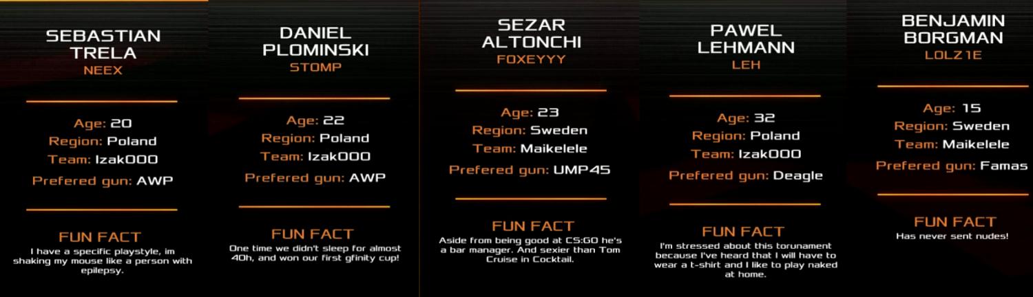 makelele reprezentuje szwecje. W pierwszym dniu - sporo błędów ale wygrali chyba 2:0 w mapach, wczoraj niebo lepiej, organizacja i bardzo dobrze aimowo lecieli. Wydaje mi się, że poziom jednak trochę wyższy jak izak, bo jednak doświadczenie i pewne ustawienia makelelego robią robotę.
