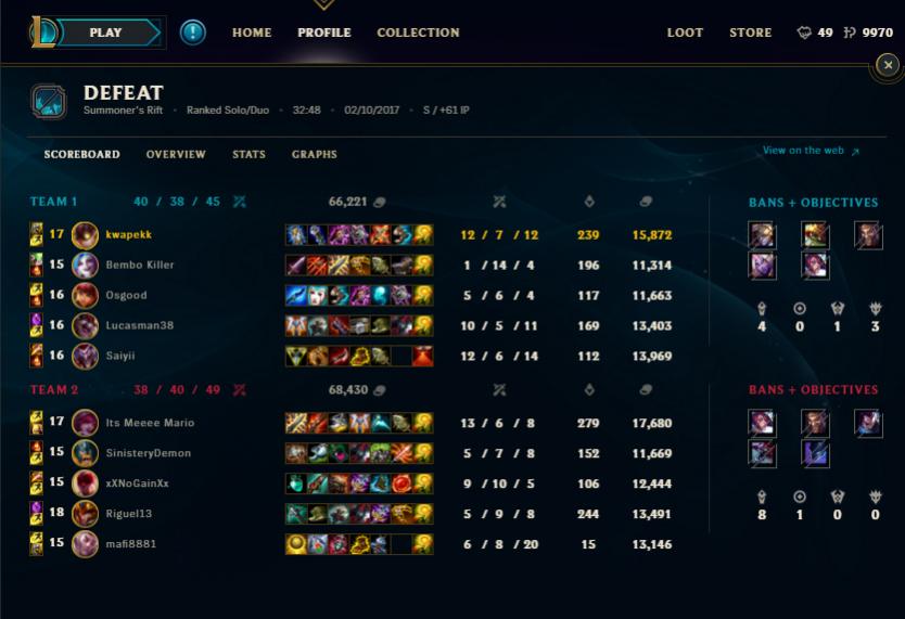 jak sobie tak sprawdzilem twoje op.gg rafalos to na wiekszosci champow masz kda ponizej 3 i winrate ponizej 50%, po co grasz tyloma championami i jeszcze tyle rol, wez sobie ogarnij 2 role, po 2 champy, ktorymi najlepiej ci sie gra, postaraj sie mniej padac, bo mega czesto padasz na linii, nie wiem czy wynika to z braku wizji, czy z tego, ze gonisz za killami, kiedy trzeba odpuscic albo po prostu nie znasz championa, ktorym grasz i ciezko ci ocenic kiedy przegrywasz/wygrywasz wymiany