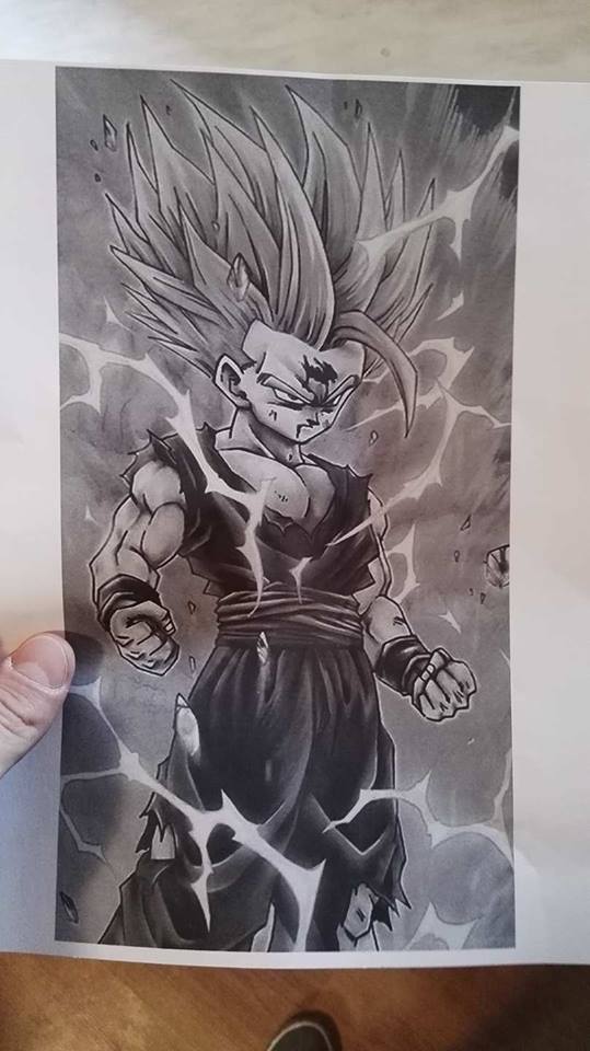 Oryginał sceny na którym było wzorowane (SSJ2). Fakt, wydają się mniejsze ale to chyba przez krzywiznę ramienia. Jak mam twarz na środku, to prawa ręka jest 1 cm od czubka bicka.
