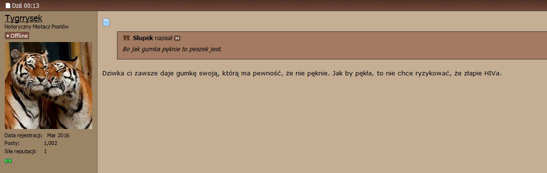 O wspomniane 100% musisz czepiać się tłuków, którzy na torgu o tym pisali, bo z moich ust nic takiego nie padło. Ja napisałem, że ma pewność i ja również stosując czy to tabletki czy prezerwatywy również miałem pewność, że antykoncepcja będzie skuteczna. Ja miałem pewność i robiłem to na relaksie, ale widzę, że tu same dzieci z osranymi majtami, które się boją własnego cienia. Boją się, że gumka im pęknie, bo tak wyczytali w googlach czy w Bravo, albo jakiejś innej kolorowej gazetce. Nie moja sprawa. Możecie się bać nawet z domu wyjść i do końca życia siedzieć przed komputerem.
