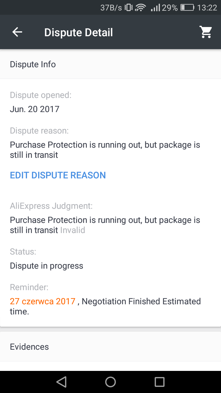 Zalozylem dispute i jako, że wysyłka była wysyłana przez ali to od razu oni tym się zajmują, no i dostałem info ze invalid, ze mam czekac jeszcze 10 i 12 dni odpowiednio do dwoch tych samych produktow, nie moge nic dalej zrobic ani zaakceptowac ani nic, napisane jest ze spor sie konczy 27 za tydzien z tego co rozumiem, no i czy to oznacza ze zamkna spor i przegralem?-ciezko mi to zrozumiec