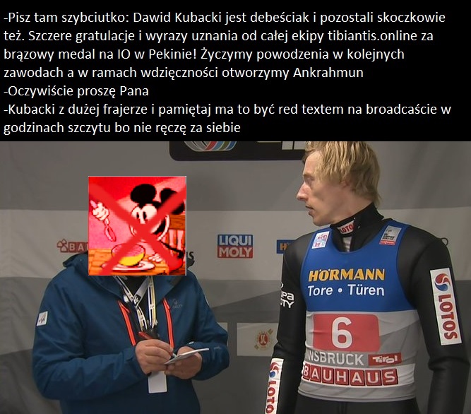 Coś pięknego z tą Kanadą. Drużyna, która miała cały czas pod górkę, zabrali im finansowanie, teraz zdobywają medal... wiadomo można mówić, że to przez dyskwalifikacje. Tylko te DSQ nie wzięły się znikąd, jak tam poprzednio jedna typiarka miała o 10cm za długi kombinezon xD Z resztą trener Norwegów sam stwierdził, że wszyscy jadą na cienkiej linii balansowania pomiędzy legalnym i nielegalnym sprzętem, to co się teraz dziwią i wkurwiają. Plus taki, że Horngacher może w pizdu rzucić skoki, jednego buca mniej.