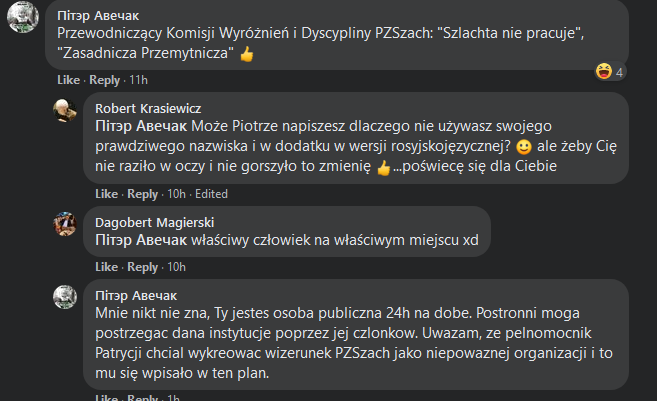 Rozmowa w komentach pod tym newsem z infoszach o wywiadzie. xD Przewodniczący Komisji Wyróżnień i Dyscypliny PZSzach w pracy mial "szlachta nie pracuje", a w szkole "Zasadnicza Przemytnicza". xD Wiadomix, ze to tylko FB, ale piekny obraz czlowieka to rysuje xD