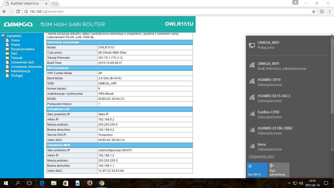 Mam internet z neostrady, połączony przez modem z Netii. Wszystko działa. Niestety ostatnio w domu był remont, nikt nie dopilnował, żeby prezwód od gniazdka telefonicznego biegł pod listwami i chcąc mieć dostęp do internetu prez pół mieszkania ciągnie się przewód z gniazdka telefonicznego do modemu. Żeby to obejść kupiłem router, Omega owlr151u. Wszystko podłączyłem i internetu na kompie nie ma. Na telefonie u dwóch domowników jest. Uruchomiłem diagnostykę i okazało się, że karta sieciowa nie ma poprawnie skonfigurowanego adresu IP (help). Jako karty sieciowej używam czegoś takiego: