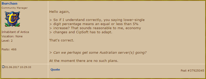 Knightmare: The content team is not really involved with the Webshop and the Store. Personally, I don't see where it would be pay to win. Even more I doubt there is a 'win' in Tibia at all since it is open ended. Generally speaking though, you have this kind of problem in many games. If two people have the same dedication to a game but one of them has less time due to work but therefore more money, is it really such a problem if someone spends his money to catch up? In the end both parties are spending resources. The problems of pay to win are quite different and the term is just used way too often in a general form. Pay to win is buying something that gives you a huge advantage that is not available in the game itself and not available through other means. And as I said, I don't see that you can really buy a 'win' in Tibia.