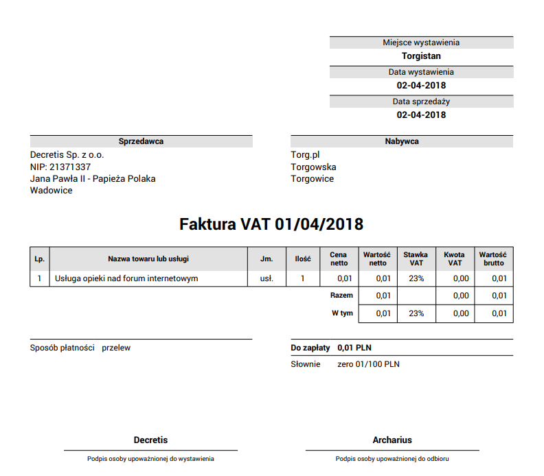 W sumie fakt, poniżej faktura jaką wystawiłem za adminowanie torgiem.