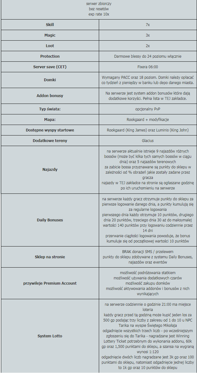 Na serwerze nie istnieje sms shop i nie będzie istniał, gracze mogą zdobywać punkty jedynie za swoją aktywność. Punkty przyznawane są za udział w eventach na serwerze, najazdach bossów jak i terenowych oraz za codzienne logowanie. Pierwszego dnia gracz otrzymuje 10 punktów, jeśli zaloguje się kolejnego dnia 20, kolejnego 30 itd, aż do maksymalnej ilości 140 punktów za jedno logowanie przy zachowaniu ciągłości 14 dni logowania pod rząd i dalej. Przerwanie ciągłości, czyli zrobienie przerwy w logowaniu danego dnia powoduje, że kolejnego dnia gracz zaczyna znów od 10 punktów i na nowo je zdobywa. 7-dniowa premium account runa została wyceniona na 150 punktów, czyli jak łatwo policzyć po raz pierwszy można ją zdobyć po 5 dniach ciągłego logowania (pierwszego dnia 10 punktów, drugiego 20, trzeciego 30, itd, co daje łącznie 150 pkt po 5 dniach). Został dodany także niekończący się kamień do trenowania za 30 pkt oraz scyzoryk za 5.000 pkt i stamina potion za 2.500 pkt. Dwie ostatnie pozycje za same logowanie ciężko zdobyć (aczkolwiek jest to realne), dlatego zachęcamy do uczestnictwa w wydarzeniach na serwerze. Sklep będzie stopniowo rozwijany o kolejne pozycje, pomagające graczom szybciej zdobyć dany addon czy zmienić płeć / imię, jednak wciąż za punkty zdobyte wyłącznie w grze.