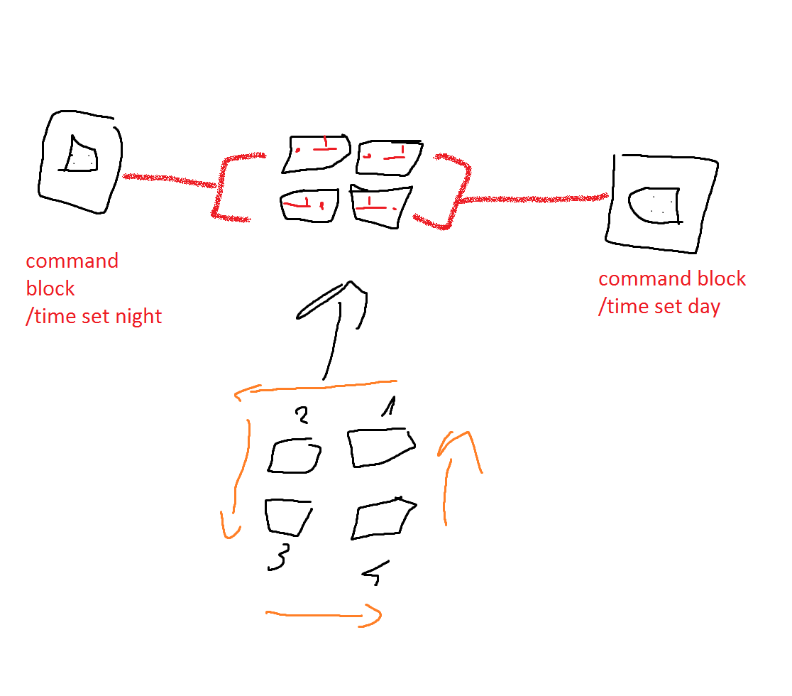 Jakiś czas temu wymyśliłem żeby to zrobić i kolega zrobił. Postawił dwa command blocki i postawił przekaźniki (to czerwone co robi opóźnienie) i rzeczywiście zmieniało co sekundę dzień na noc.