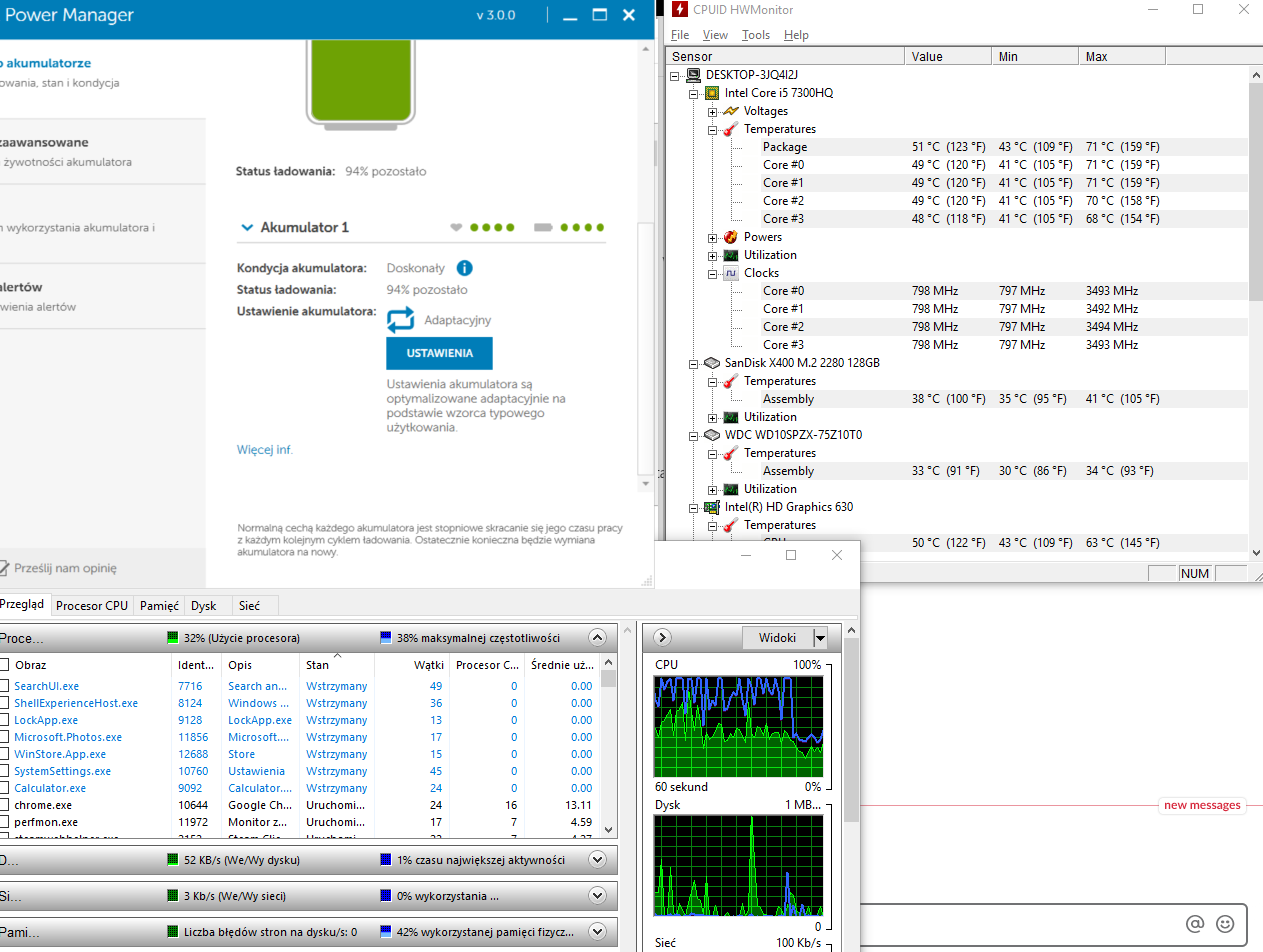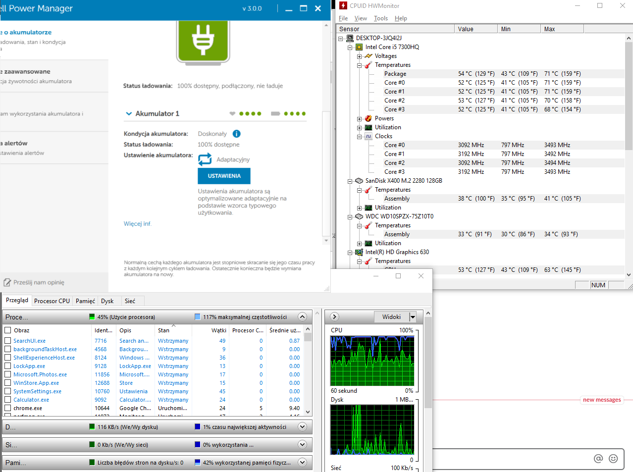 Zauważyłem że mam skoki użycia procesora w momencie przykładowo jak dużo ruszam myszką. Wtedy, w zalezności od tła programu na którym macham - jego użycie zwiększa się. W zależności od częstotliwości odświeżania, przy 125Hz o około 15-20%, przy 1kHz około 35-40%. Myszka a4tech zl5 (Bloody). Próbowałem zmienić gniazda usb, reinstalowałem sterowniki, próbowałem innej myszki, problem tej myszki nie pojawiał się na starym laptopie (asus i7 4710HQ). Bios zaktualizowany, nic specjalnego w nim nie byłem w stanie zmienić żeby miało to sens. Używam planu zasilania dell power manager, bo dość dobre opinie ma ten sofcik. W zaawansowanych opcjach zarządzania energią, przy zmianie użycia procesora np na 50-70% ilość użycia w trakcie takiego <machania> też się zmniejsza. Tak samo programy (gierki hehe), które na asusie używały maksymalnie 20-25% mocy, tutaj używają kurwa 70% i no wiem że i7 miał 8 wątków ale chryste panie na benchu nie ma aż takiej przepaści. Temperatury są w porządku (niżej screeny), wszystkie rdzenie pracują jednakowo podobnie wg. monitora zasobów. Na żadnym innym laptopie/komputerze nie spotkałem się z tym problemem, a sprawdzałem ostatnio na starych i nowych, włącznie z ryzenem od AMD. NK O CO CHODZI BO KURWA TYLE PINIENDZY DALEM I NIE WIEM CO GO BOLI.