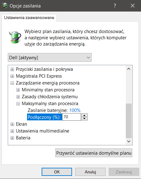 Po zmianie tego ustawienia (nie koniecznie na 70%, chyba dałem minimalke jakąś bo w biosie ma ustawienie na minimalne taktowanie 800mhz na każdym rdzeniu).