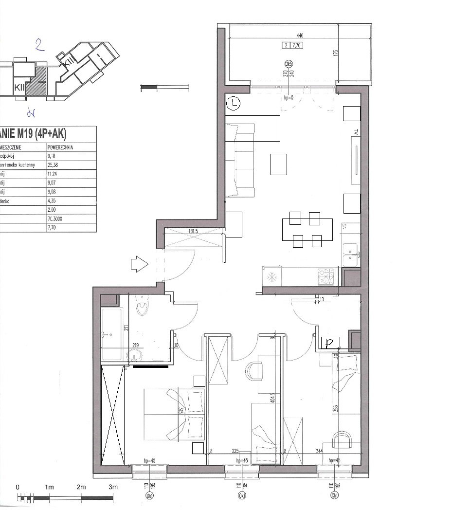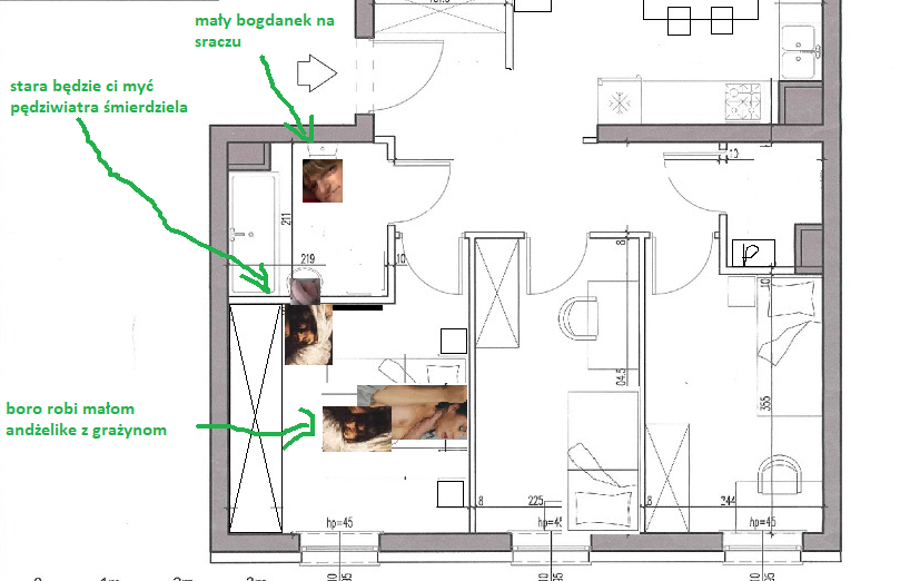 Wrzucam wam plan (już w paincie zmodernizowany przeze mnie, więc śmiało możecie pisać - to się nie sprawdzi, tu jest kurwa za mało miejsca, w łeb się pierdolnij z tym i tym itd). Nie wiem na chuj pościerałem linie pokazujące takie wartości jak długość i szerokość toteż załączę oryginalny plan, jeszcze przed borowymi POPRAWKAMI. Po cygańsku uwzględniłem już na tym planie rozmiary (że szafa w sypialni wnękowa jakoś 70 cm, że narożnik w salonie 250cm szerokości i 175 cm głębokości). Drugi kibel wyjebałem bo ja i tak praktycznie w życiu nie sram, no chyba że po jabłkach. W miejscu drugiego kibla wrzuciłem pralkę więc to odręcznie narysowane "P" oznacza , że tma będzie kurwa pralka i schowek dla harrego pottera zajebanego.
