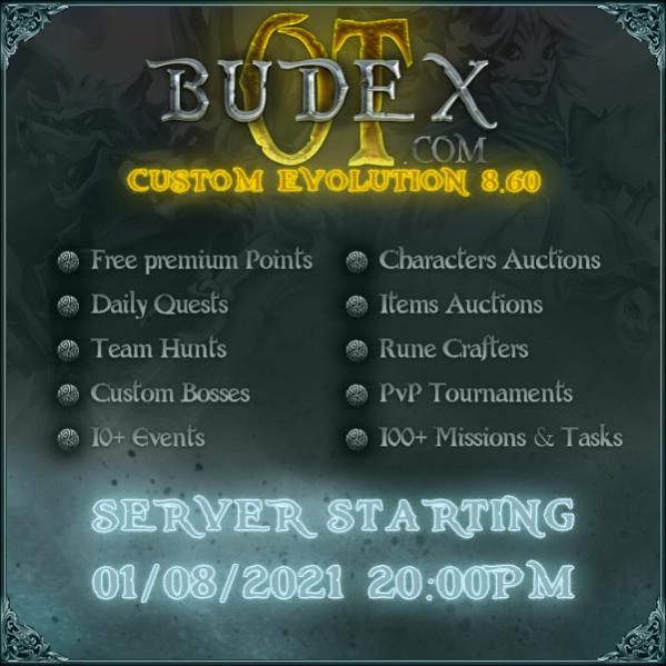 BudexOT is an Custom Evolution OT PvP-E 8.60, server created for a pleasant and smooth gameplay for our dedicated players, a fun OT which can bring you into old awesome memories, feel free to join us !