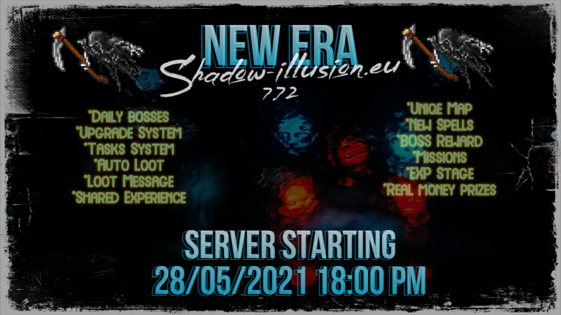 We would like to invite you to the best RPG & PVP server Old-School Shadow-Illusion.EU with a 7.72 client and a unique, reworked Illusion map, which will start on May 28 at 18:00. For the first twenty logged in people there are prizes in the form of points / premium account from SMS SHOP!