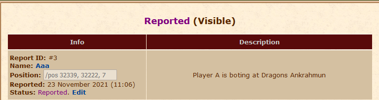 We know that even own client will not stop 100% players from using bot. So in this aspect we will need a little help from you. To report players or bugs we added command "!report Text". Every report is saved in database and can be easy accessible via website by admin.