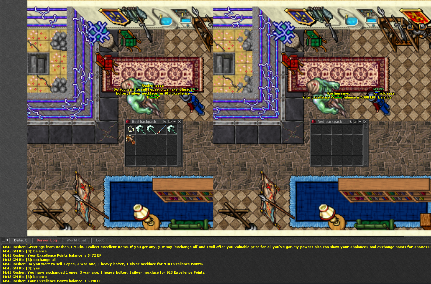 - "Golden Invasion" i "excellent items" - systemy znane z MU Online - raidy złotych mobków (1-3 sztuki tier 1 i po 1 sztuce tier 2-5) pojawiają się losowo, każdy z nich daje Box of Excellence poziomu od +1 do +5 z których zawsze leci 1 excellent item. Excellent item to ulepszona wersja prawie każdego przedmiotu (uzbrojenia) wystepującego w grze (w sumie ponad 300) posiadająca nie tylko lepsze statystyki i dodatkowe bonusy ale tez unikalne animowane sprajty (samoróbki, więc zdarzają się gorsze/lepsze okazy :P)! Excellent itemki dropią też z normalnych mobków, ale rzadko (i z dużo mocniejszych mobów niż zwykły odpowiednik).
