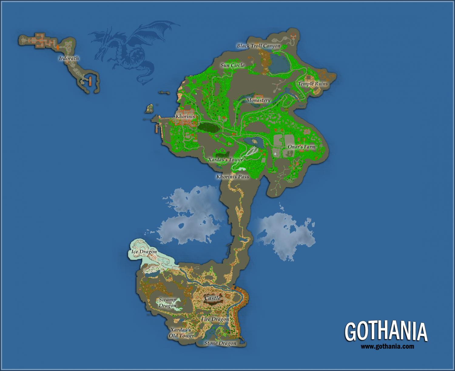 Świat Gothanii znajduje się na jednym wielkim kontynencie o nazwie Khorinis i kilku wyspach.