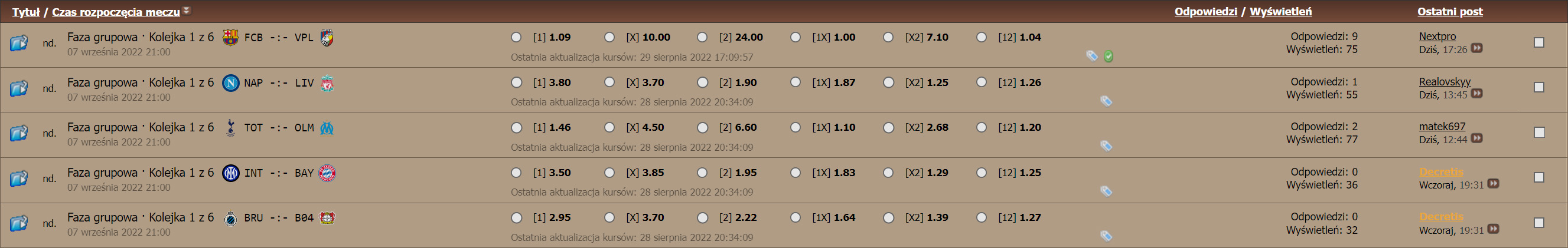 Typować można w forum związanym z danymi zawodami (lista takich for dostępna jest w menu na samej górze, tuż obok Torg Premium, do którego też możecie zajrzeć xD). Tam znajdować się będą wszystkie spotkania. Wystarczy przy odpowiednim zaznaczyć pożądany typ i gotowe. Jeśli wszystko pójdzie okej, obok daty z aktualizacją kursów pojawi się data waszego typowania. Tematy/mecze których nie typowaliście są odpowiednio wyróżnione. Tematy domyślnie sortowane są od najnowszego do najstarszego, możecie to zmienić poniżej listy w sekcji "Opcje wyświetlania tematów".