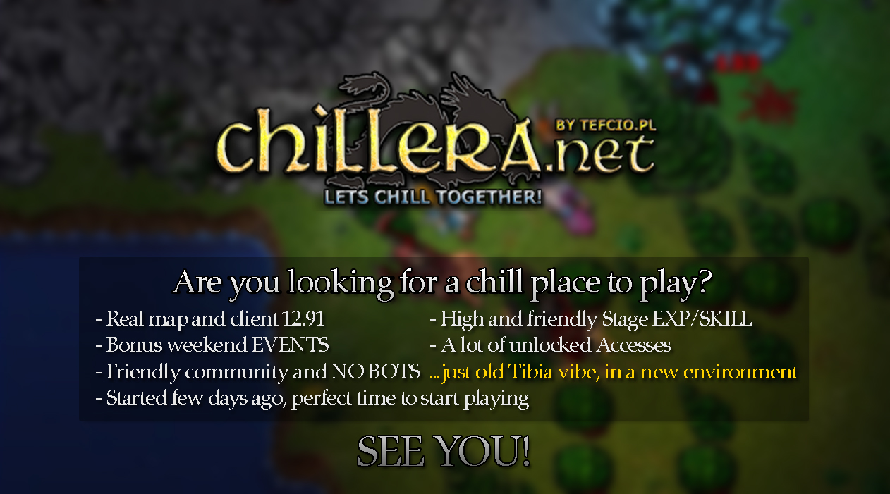 Hej! Przychodzę do Was z projektem w miarę spontanicznym, aczkolwiek z sensownym zamysłem. Jak nazwa mówi, stawiamy na pełen relaks podczas rozgrywki, opracowaliśmy raty oraz skrypty/dostępy tak, aby grało się u nas jak najprzyjemniej - jako dobra rekompensata na dobry koniec dnia po pracy/szkole. Również jesteśmy graczami, aczkolwiek z czasem bywa ciężko - pracujemy, mamy wiele swoich zajęć i miejsce dla takich graczy jak my chcieliśmy zrobić. Jesteśmy fanami real tibii, nie gustujemy w Evo ani żadnych grubszych customach. W związku z tymi wszystkimi aspektami, pragniemy zaprosić Cię na spa, miejsce relaksu pełne nostalgii - na chillera.net. Server full real tibia 12.91, z dostępami, chillowymi rateami oraz śmiesznie tanim sklepem(bez pay2win, jedynie dekoracje/outfity/mounty). Nie mamy na celu zarobku z posiadania OTSa, mikropłatności związane głównie z elementami dekoracyjnymi mają na celu autonomiczne utrzymanie się serwera. Czyli po prostu wszystko jest reinwestowane - w razie większych przychodów - w rozwój maszyny, na której stoi serwer. Osoby odpowiedzialne za sprawy techniczne to osoby z wykształceniem informatycznym/programistycznym i z doświadczeniem w dziedzinie webmasteringu. Serwer jest bezpieczny i w pełni stabilny, a napotkane błędy będą w miarę możliwości czasowych na bieżąco naprawiane. Serwer wraz z rozwojem real tibii będzie wprowadzał update'y bliźniacze do tych z reala.