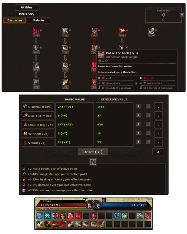 Regardless of who you choose, you will have to make the next important choices regarding our skill system, which has replaced classic training. From now on, for each gained level you will receive a certain amount of skill points to invest according to your level. The picture above can help you find the most suitable skills for your profession. The same thing applies to our fully custom spells system, they can be learned and upgraded by spending special points. And of course, you don't have to learn incantations, just simply click on a spell icon or use the desired hotkey to cast a spell. To help you manage all spells we've designed a special spell bar (you can display your level, statuses, health and mana points there!)