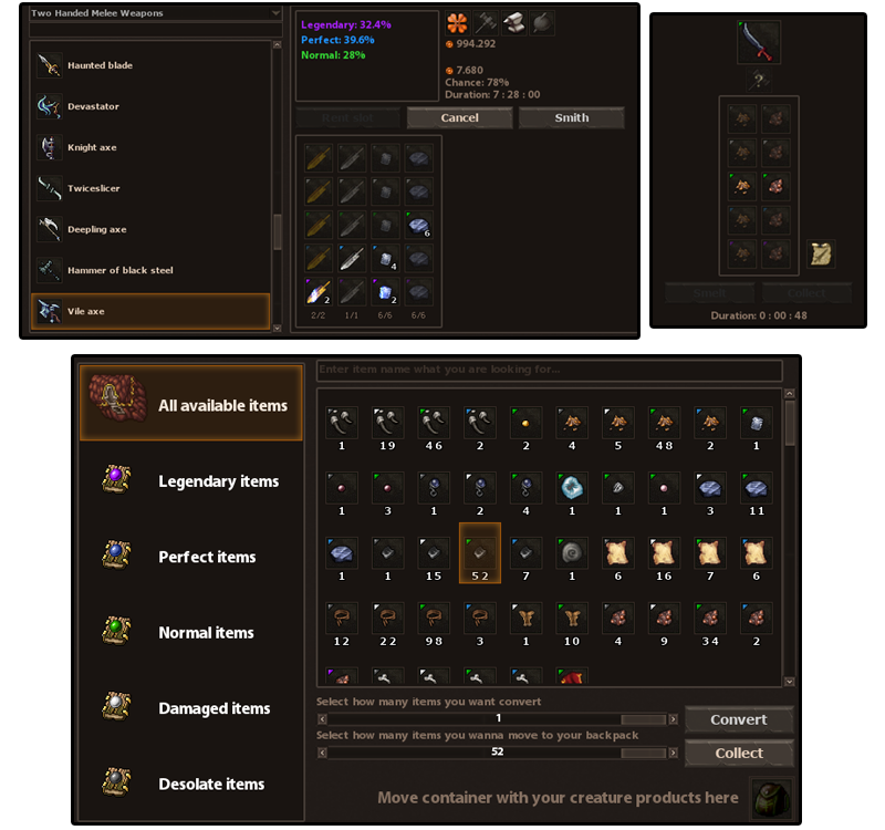 In this section, we will try to mention the most important systems present in Ranger's Arcani. Let's start with Forge, Smelter and Magazine. A lot of items gained during your play can be crafted or smelted. To smelt an item you just need to put it into Smelter, to craft an item in the Forge you need a special scroll with a blueprint. Smelting and looting give you the crafting materials needed for crafting. Items and materials can have 5 different quality types: desolated, damaged, normal, perfect and legendary. You can also find unique items with special bonuses to spells but they're not craftable. All crafting materials can be stored in Magazine so they will not waste your space and capacity, but you need to be in the protection zone to transfer them from your inventory.