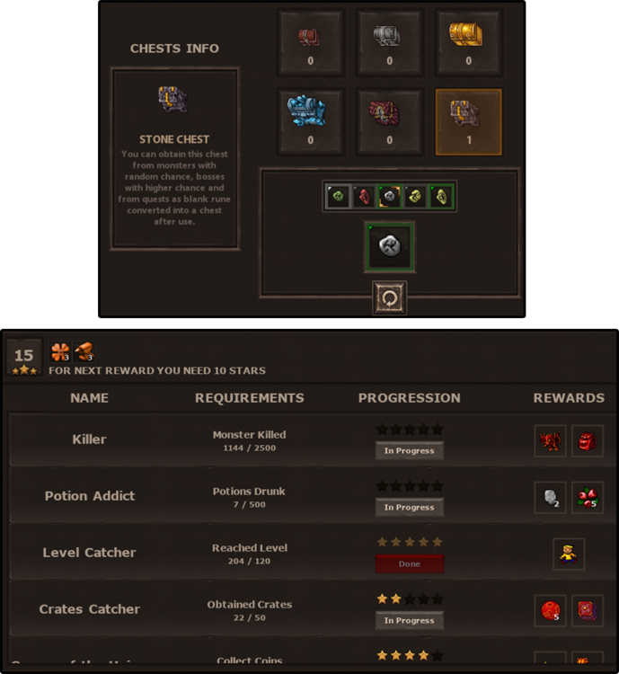 The next important addition is a chest system. You can obtain various chests from monsters, tasks, bosses or quests. Some of them let you roll runes, special backpacks or crafting materials. We've also got Achievements, rewards from them, unlike chests, are known in advance.