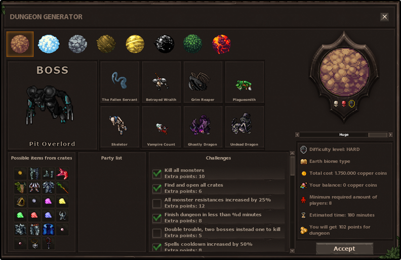 Apart from a basic premade map, there is a dungeon generator. It is accessible after a certain quest and it generates random dungeons based on prepared "tiles". It's up to you what kind of biome you want to visit, how hard it should be or how many friends you want to take with you!