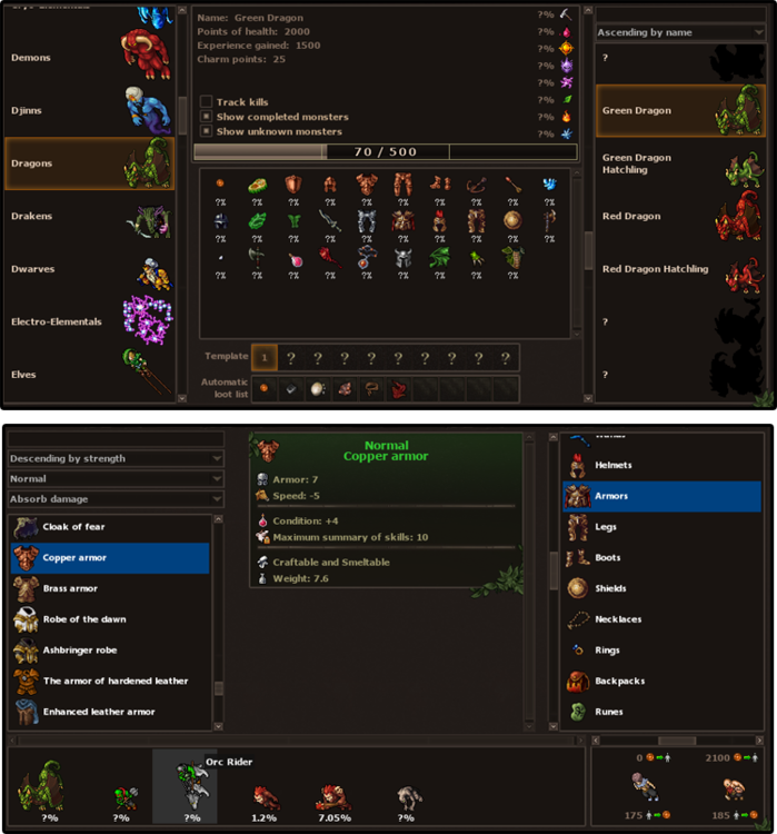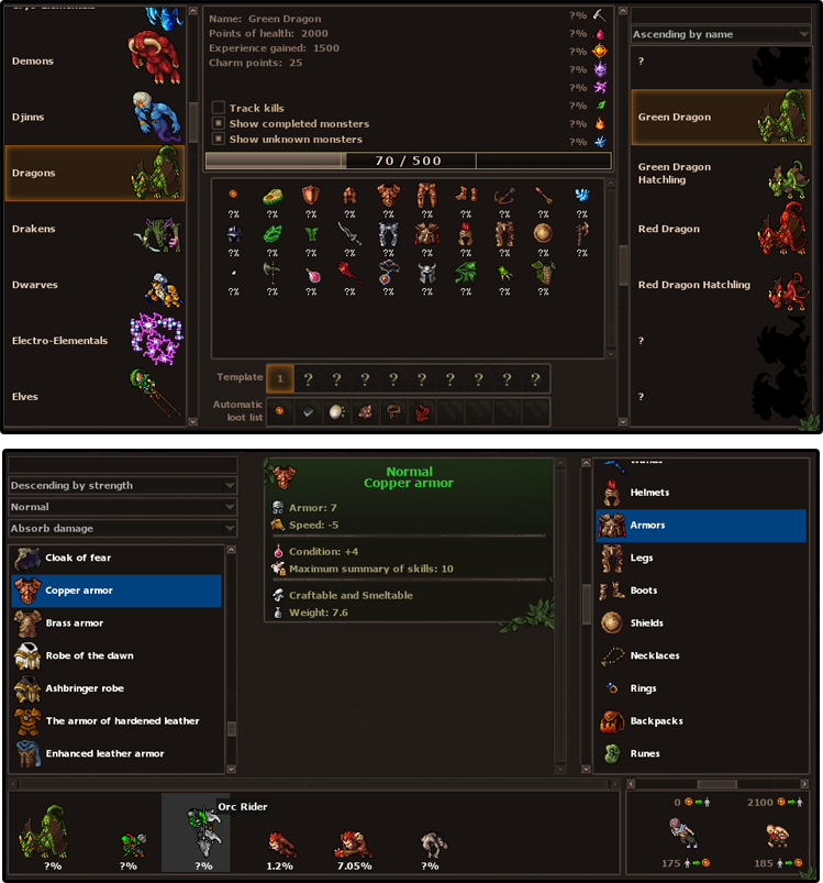 To make it easier for you to understand the game, we're offering you an Encyclopedia. There is a lot of useful information. Starting with Bestiary - you can check monsters categories and after killing a certain amount of monsters you will learn about their loot, weaknesses and strengths. In this section, you are able to set up an Auto Loot system. The next part of the Encyclopedia is an Item List. Just like Bestiary, items are grouped into categories and you can check all their details (even on different quality types). You can also sort them in many ways to find an item that suits you best. At the bottom, you will find monsters that drop your desired item and NPCs that will buy or sell it.