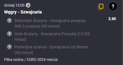 Węgry – Szwajcaria 15 czerwca 2024 15:00 (czas środkowoeuropejski standardowy) UEFA Euro 2024 » Faza grupowa · Kolejka 1 z 3