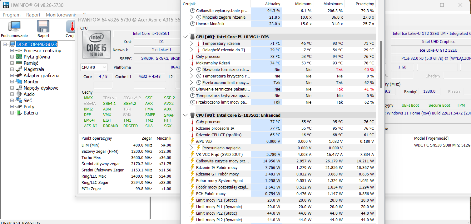 Dziś włączyłem program HWiNFO i z tego co tu zaobserwowałem to grafikę mam wydaje mi się zintegrowaną a temperatura procesora jest bardzo wysoka.