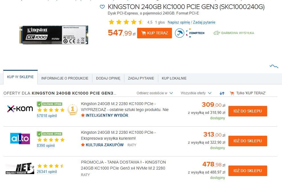 Do dziś (przez cały tydzień miałem lepszego Kingston KC1000 240GB na kościach MLC za 309zł. Ale ja wszystkim nie jestem w stanie doradzić, mam też własne forum na głowie.