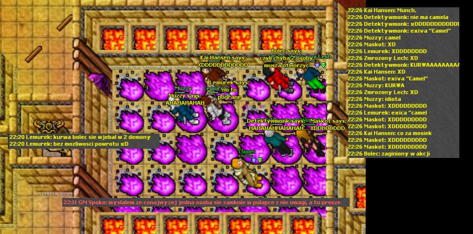Ale z pomocą przyszedł Tibijski bóg i jakoś się wydostaliśmy xD Logiczne więc było, że gdzieś jest kolejna dźwignia i trzeba dwie naraz kliknąć. Więc zrobiliśmy to samo - druid north a my w 4 osoby na south z amuletem poszliśmy. Z początku się pogubiliśmy bo kurwa Lemur twierdził, że w lewo a palladyn Bolec twierdził, że w dół. Finalnie wszyscy oprócz czwartego ziomka poszli w dół (czwarty ziomek - camel, nam się zagubił bo nie miał scarab coina :((( ). Ja byłem trochę z tyłu. Schodzę schodami i widzę kolejne schody obok, których stoi Lemur xD Myślę, okej schodzę na dół. A tu kurwa 115 paladyn paraduje z dwoma demonami w pokoju ze schodami z kratami xD jeden się przerzucił na mnie i miałem 100 hp i na pałę wbiegłem w korytarz 1sqmowy, gdzie okazało się, że jest druga przez nas poszukiwania dźwignia. Załącznik 359058