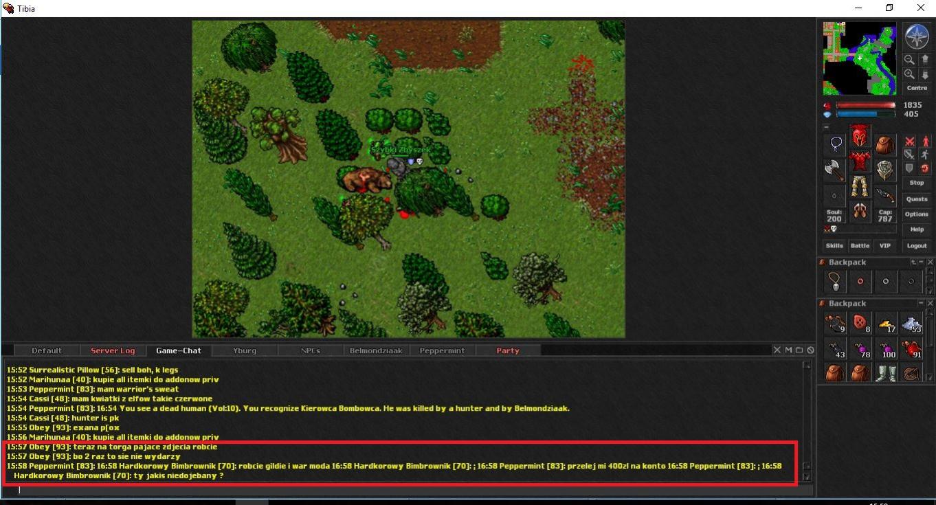 No to niezly server pvp. Poszedlem se dzis na expa na stara fortece chcac dobic 121 poziom na moim bohaterze (wczoraj niestety przezylem smierc przez moich kolegow i spadl mi poziom doswiadczenia). Zabilem troche potworow, swietnie sie walczylo, ale niestety moja mikstury wielkiego zdrowia oraz mikstury many rychlo sie konczyly dlatego postanowilem powoli wrocic do miasta. Zatem wychodze spokojnie z fortecy az tu nagle... !! Na moje drodze stanal postrach servera, niekwestionowany krol mordercow i skrytobojcow. Obey. Tak on, sam w sobie, stanal na mojej drodze i zaczal bombardowac moja zbroje poteznymi runami naglej smierci oraz zakleciami ostatecznej eksplozji. Ciosy byly potezne jednak mimo to udalo mi sie jakos zawolac na pomoc mojego niskolevelowego kolege Pepperminta, ktory rychlo (po 15 minutach chyba :kappa ) przybyl mi na ratunek. Rownoczesnie do poteznego maga dolaczyli jego koledzy Hardkorowy Bimbrownik oraz Ruthless Reign (legendy glosza, ze jest jeszcze potezniejszy od krula obeya). Rozpetalo sie prawdziwe pieklo! Na pomoc dolaczyli do nas Belmondziak, a nieco pozniej Yburg! Walka, ktora odbyla sie na Trimerii byla iscie widowiskowa, a wynik ZUPELNIE NIEPRZEWIDZIANY.