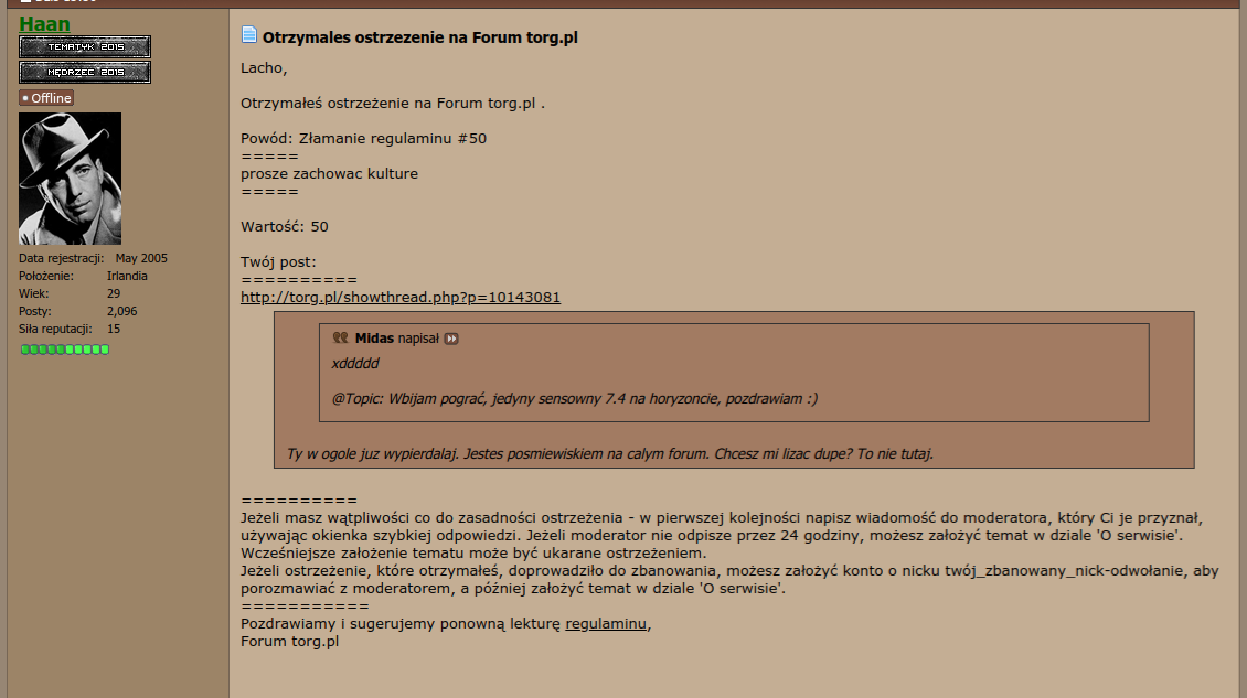 Znowu dostalem warna za midasa, ktory mnie sprzedal! Niech zyje TORG! Albo niech lepiej nie zyje.