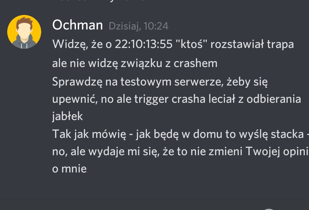 Jeśli dobrze wszystko rozumiem, to naprawdę zadziwiający zbieg okoliczności. Byczkowi się przypomina bug, którego kiedyś znalazł na test servie i ZRAPORTOWAŁ. Efektem buga był wtedy crash serwera. Ziomek Byczka idzie sprawdzić, czy bug nadal istnieje. O 22:10 i 13 sekund rozstawia sidła - co potwierdza sam Ochmar. A na discordzie Tekanii możemy zobaczyć, że o 22:11 lecą już wiadomości, że serwer wywalony na plecy.