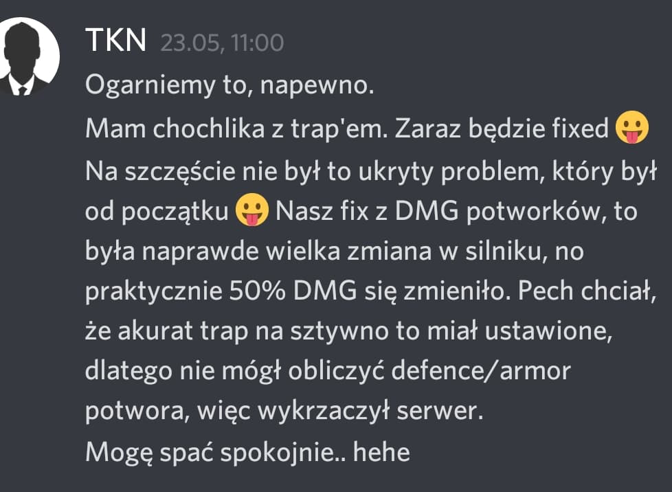 Co do buga, że wpushowanie w trapa hieny wywalało serwer nic nikomu nie mówiłem, ale po ostatnich akcjach co tu się odpeirdala poczułem się jakby ktoś pluł mi w twarz i mówił, że pada deszcz postanowiłem z kolegami sprawdzić ten smaczek i co? tak jak widać wczoraj ;) bardzo mocno chciałem grać na tym serwie mimo bugów i błędów, które występują, typu postać robiąca fikołki przy skosach mijajaąc potwory, potwory bijące z meelee jak poejbane (tak to też było fixnięte) i wiele innych...nie chce mi się produkować jestem w pracy może wieczorem napiszę jakiegoś posta na otlandzie, nie, nie dlatego, że hejtuje server bo potencjał był nawet przy bugach i widzę go do tej pory ale administracja robi z graczy debili, jeżeli ktoś lubi być tak traktowany to spoko, to MY tworzymy serwer nie developerzy, a jak traktuja graczy jak śmieci wciskając kity to po co mam ich dalej bronić i próbować tworzyć fajne community