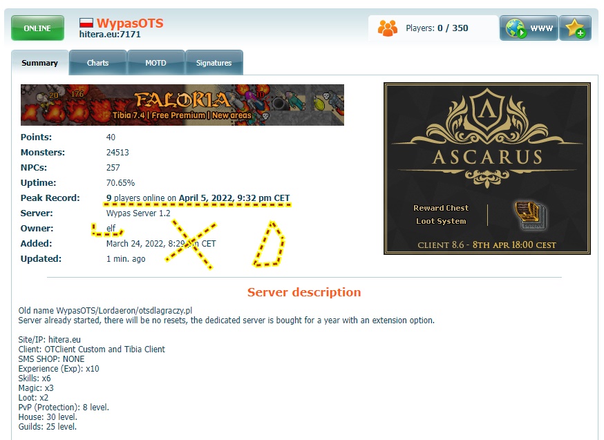 Serwer się rozkręca powoli, online można zobaczyć w grze,dzisiaj grało 12 osób, w niedalekiej przyszłosći planujemy zatrudnic jakiegoś streamera, żeby serwer bardziej rozkrećic, jeżeli ktoś kiedyś grał na WypasOTS aka Lordaeron albo zna mapę Karmia/Vanilla to zapraszamy do wspólnej gry. :)