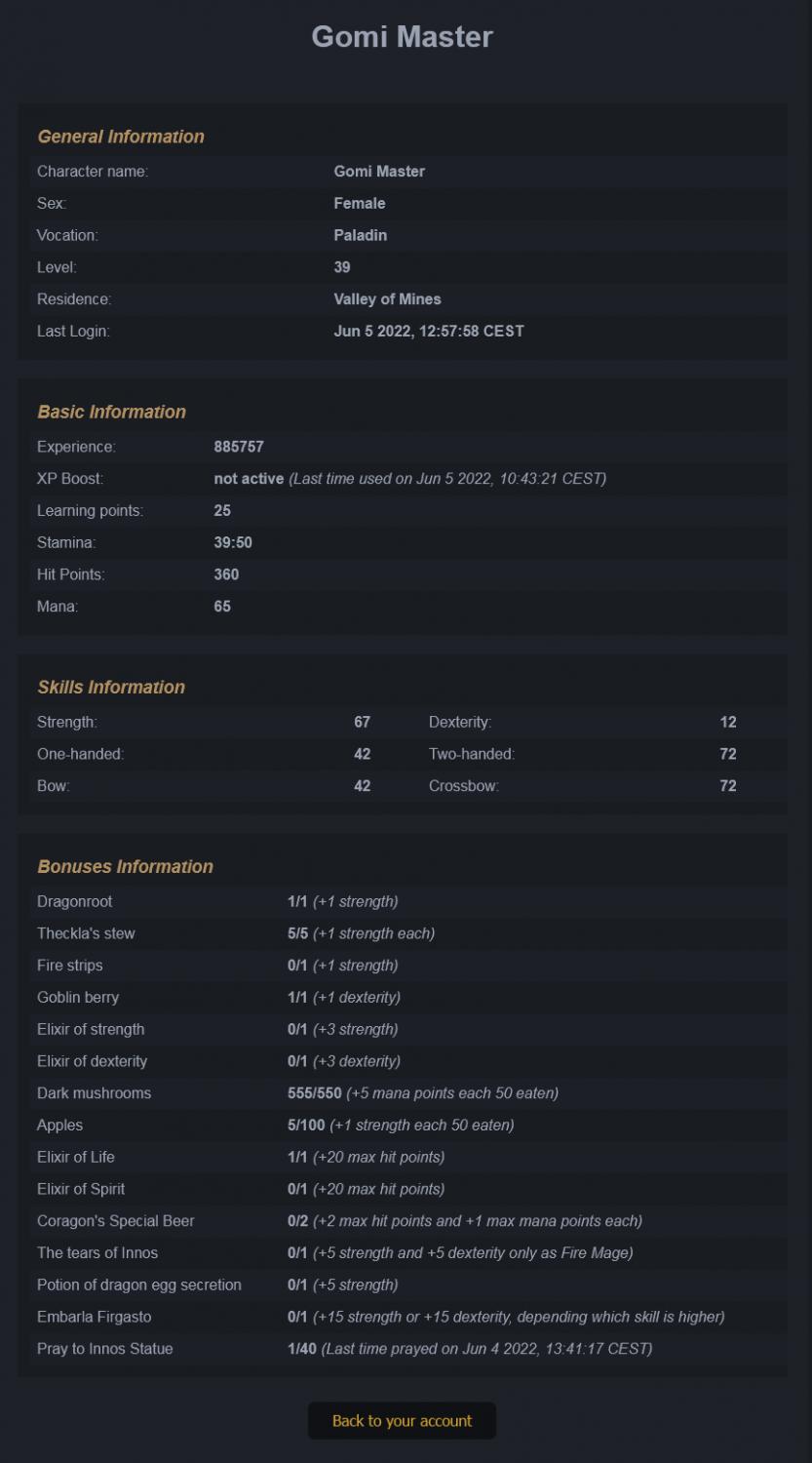 - każdy bez gildii (no vocation) otrzymuje co level: 5 punktów życia, 0 punktów many i 10 punktów udźwigu (cap)
