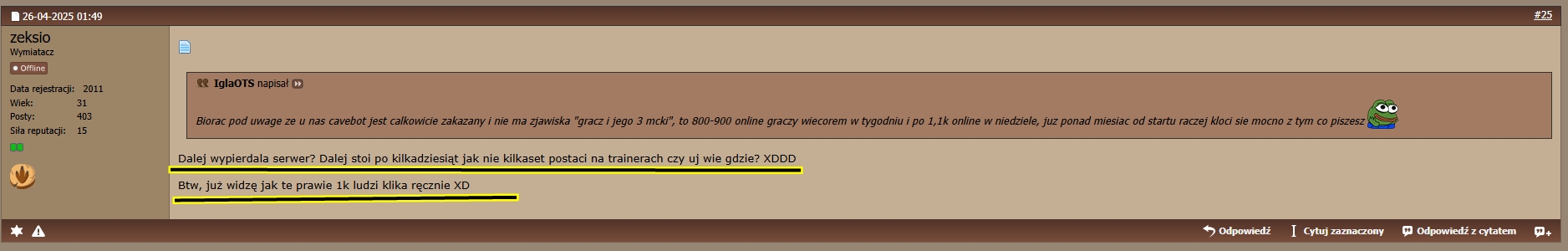 Gdybyś dokładnie czytał i patrzył na obrazki to byś wiedział kiedy dodałeś posta i co jest na screenie z online na otsservlist. 25-04-2025 19:52