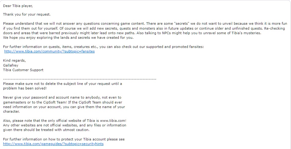 Proszę zrozumieć, że nie odpowiemy na żadne pytania dotyczące zawartości gry. Jest kilka „tajemnic”, których nie chcemy ujawniać, ponieważ uważamy, że fajniej będzie, jeśli odkryjesz je dla siebie. Oczywiście dodamy nowe sekrety, questy i potwory również w przyszłych aktualizacjach lub będziemy kontynuować starsze i niedokończone questy. Ponowne sprawdzanie drzwi i obszarów, które były wcześniej zablokowane, może później prowadzić do nowych ścieżek. Również rozmowa z NPC może pomóc w rozwikłaniu niektórych tajemnic Tibii. Mamy nadzieję, że spodoba Ci się odkrywanie krain i tajemnic, które dla Ciebie stworzyliśmy.