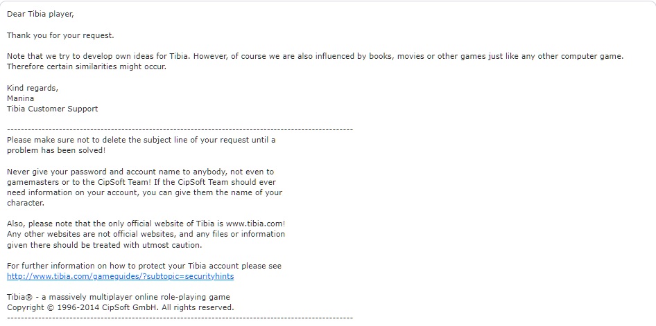 Pamiętaj, że staramy się rozwijać własne pomysły dotyczące Tibii. Jednakże, oczywiście, jesteśmy również pod wpływem książek, filmów i innych gier, tak jak w przypadku każdej innej gry komputerowej. Dlatego też mogą pojawić się pewne podobieństwa.
