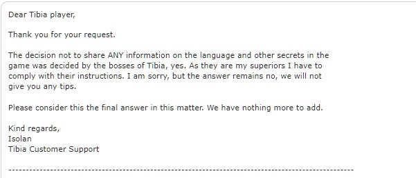 Decyzja o nieudostępnianiu ŻADNYCH informacji dotyczących języka i innych tajemnic o grze zdecydowali bossowie Tibii, tak. Ponieważ są moimi przełożonymi, muszę