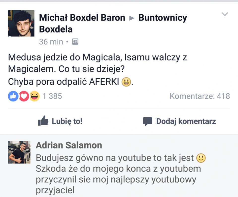 Takiego rakowiska jak ten cały youtube to jeszcze nie widziałem i nie mówie tu o danielu. Jak są jakieś większe dramy to sobie je troche przelece o co tam chodzi no i jak ta drama z gimperem, jak teraz te dramy z isamu itd. tylko mnie w tej opinii utwierdzają :D. Wielcy obrońcy moralności, którzy są miliard razy bardziej fałszywi i toksyczni niż ten cały magical. Patola jest pewnie ta sama, tylko ukrywana, bo jak wychodzi, że jakiś Isamu opierdala matkę swojego dziecka, poniża ją często na streamie i znęca się nad nią psychicznie, jeszcze przed setkami tysięcy ludzi to jak to nazwać? :D