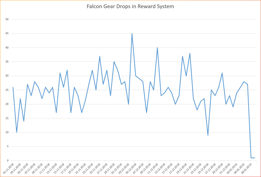Wstępne dochodzenie i dogłębne analizy nie były w stanie udowodnić doniesień o wzroście przedmiotów Falcon lub innych przedmiotów z bossów, opierając się o system dropu. Diagram Falcon przedmiotów pokazuje, że ilość przedmiotów w przeciągu ostatnich tygodni nie powinna być powodem do niepokoju.