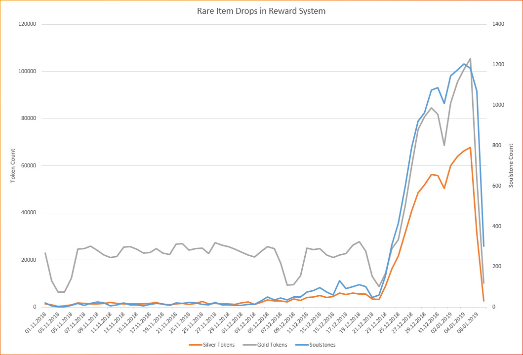 Wyjątkiem jest Percht Queen z eventu przesilenia zimowego. Diagram Tokenów oraz Soul Stone pokazują wzrost liczby Gold Token oraz Silver Token. CipSoft żałuje problemów wynikających z tego. W sobotę usunięto Tokeny z łupu Percht Queen, co ustabilizowało dzienną dystrybucję.